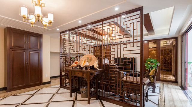 中式屏風做成的護墻與中式刺繡搭配